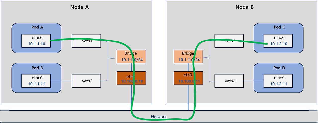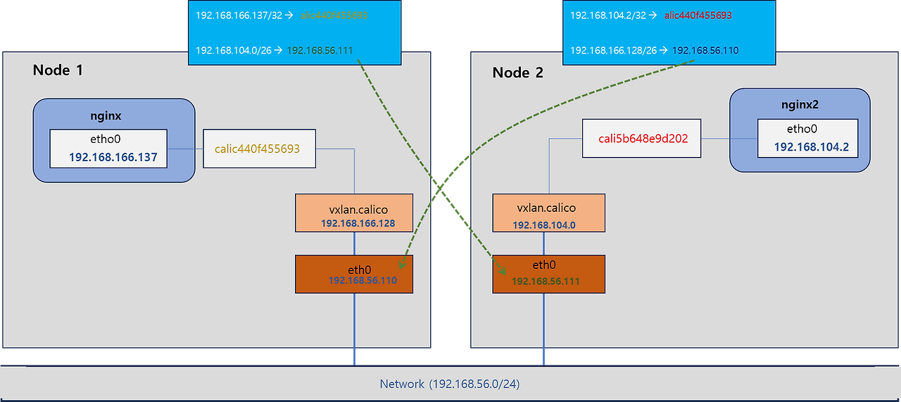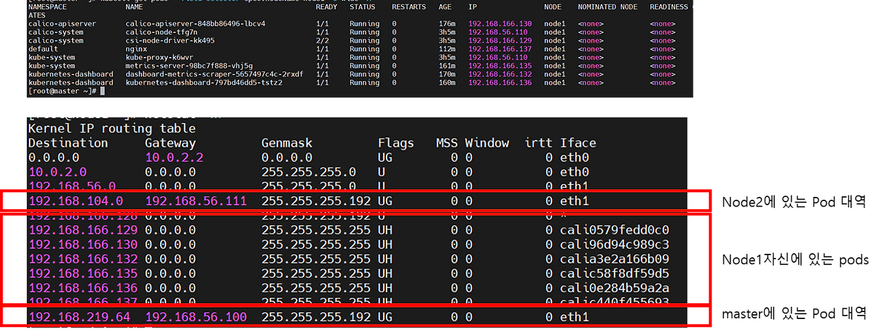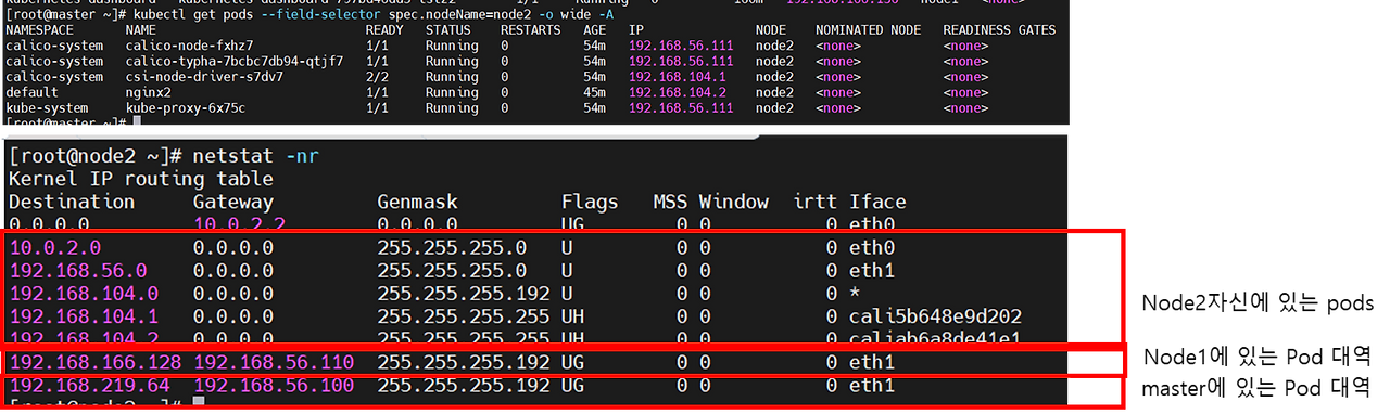 Node1 Routing Table에 Node2에서 생성된 Pod를 위한 Network 대역이 Node2를 next hop으로 바라보고 있기 때문