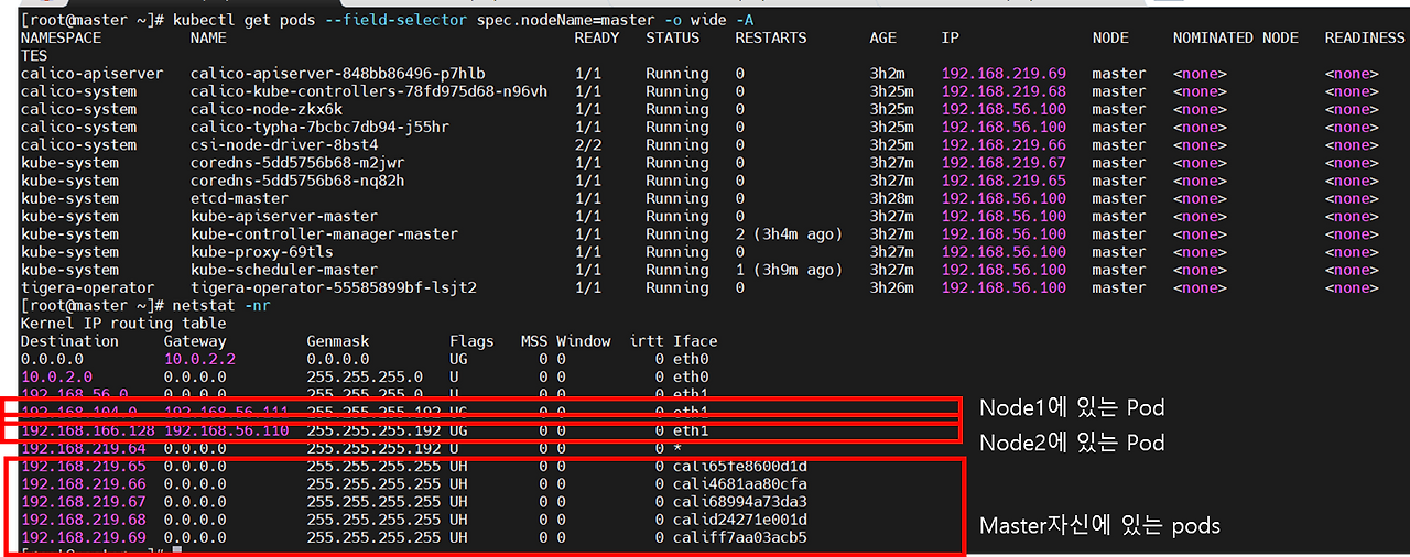 이제 Pod간 통신을 위해서 Routing table이 어떻게 구성 되었는지 확인