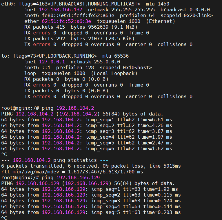 node1에 배포된 nginx(192.168.166.137)에서 node2 배포된 nginx2(192.168.104.2)로 ping 테스트