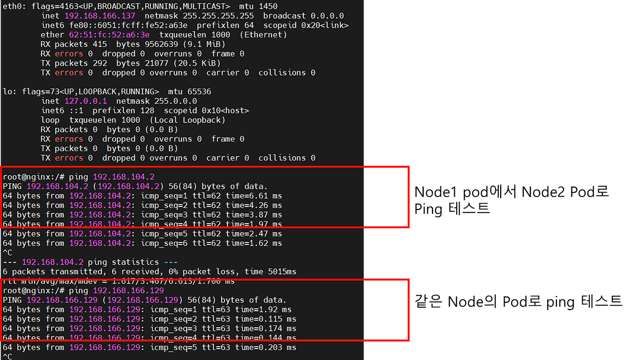 그리고 node1에 배포된 nginx(192.168.166.137)에서 같은 node1에 있는 Pod인 192.168.166.129로 ping 테스트
