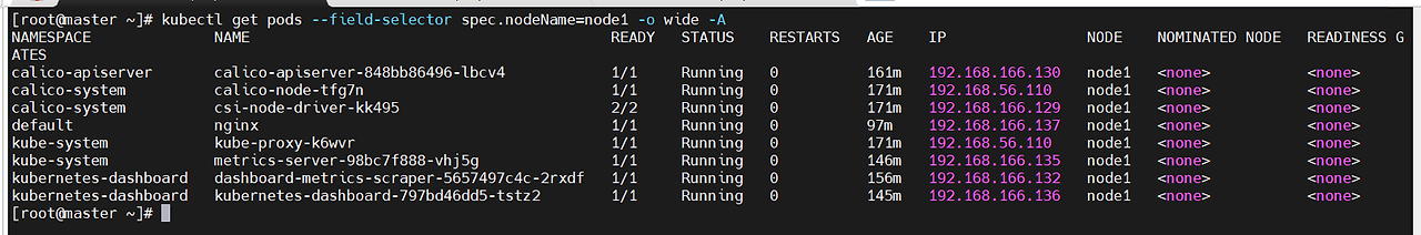 kubectl get pods --field-selector spec.nodeName=node1 -o wide -A